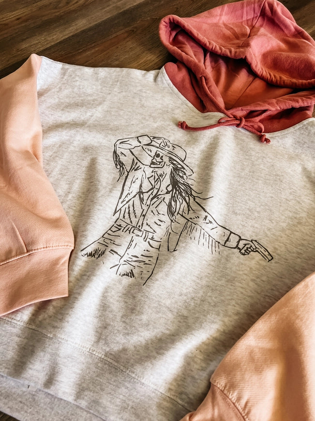 This pink tricolor hoodie featuring the gray Shoota design is every emo-cowgirl’s dream. With a women's fit that’s slightly cropped and incredibly soft, it’s the coziest piece you’ll never want to take off. Hurry and grab yours before they’re all gone—these hoodies are flying off the shelves!
