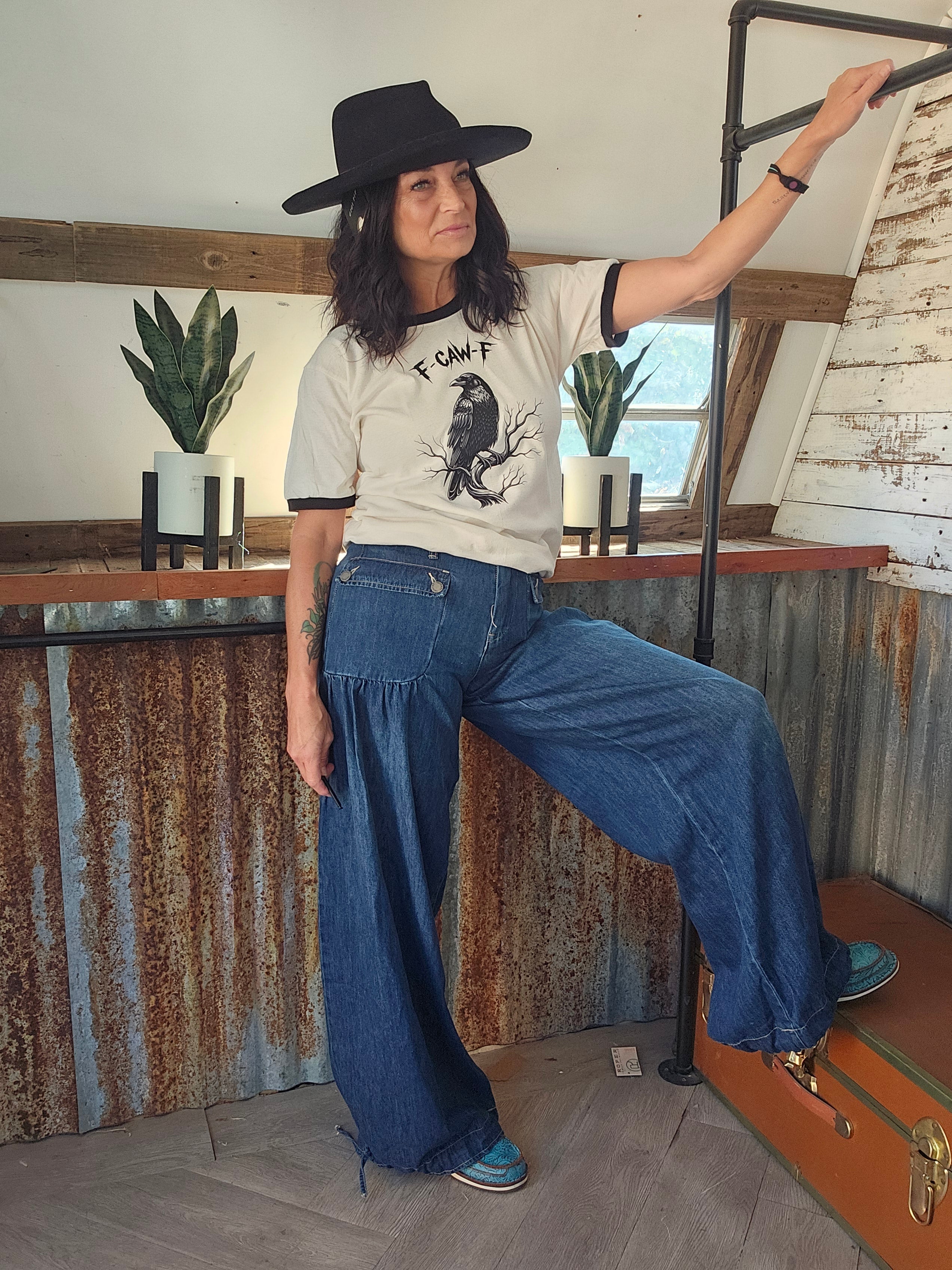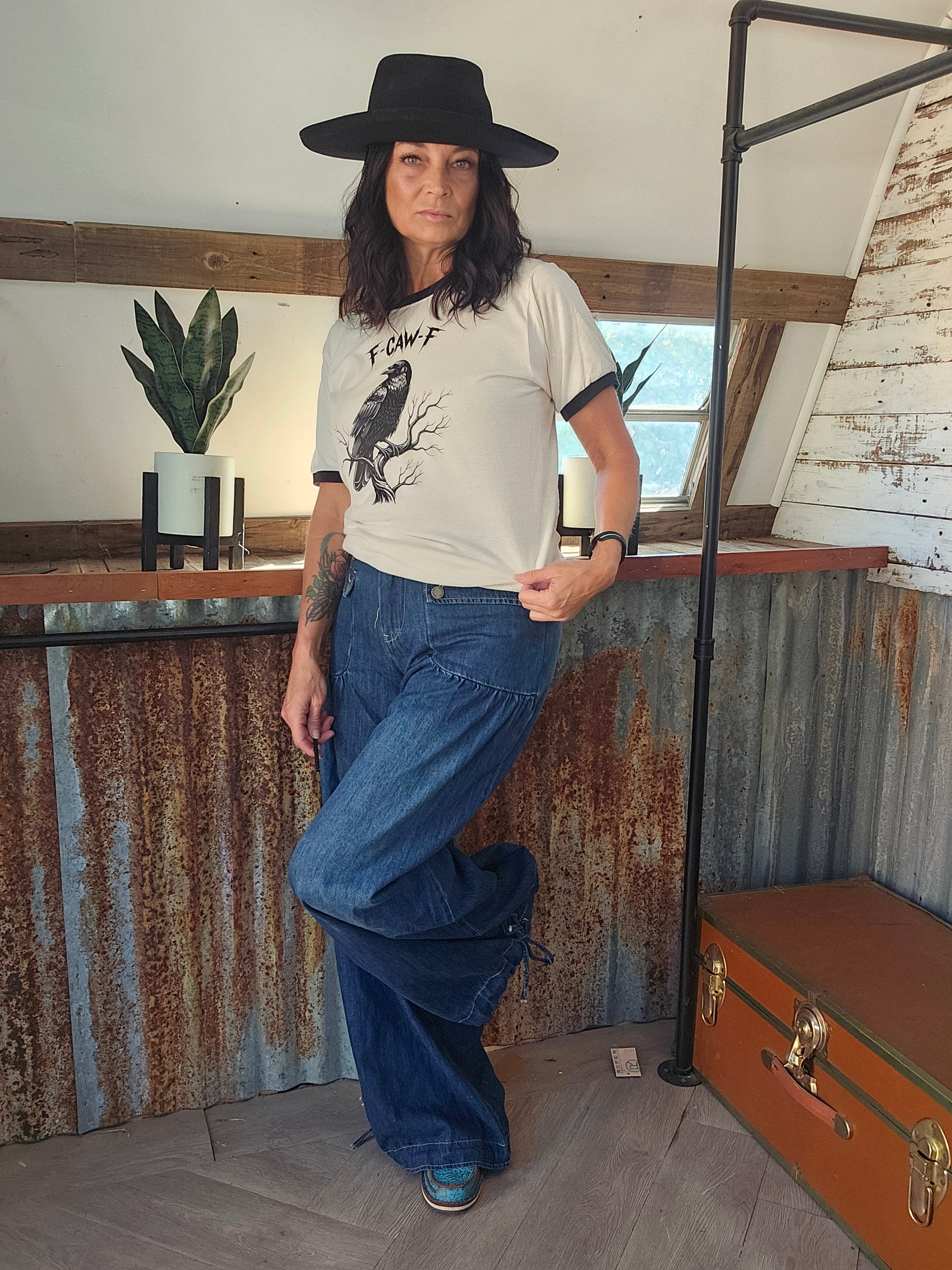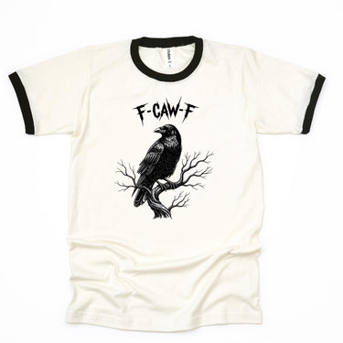 Embrace Halloween humor without saying a word in the F-caw-F Halloween ringer. This playful tee layers classic fun with cozy flannel flair, perfect for making a subtle yet bold statement at any spooky gathering. Let your outfit do the talking while you enjoy the season in comfort and style.