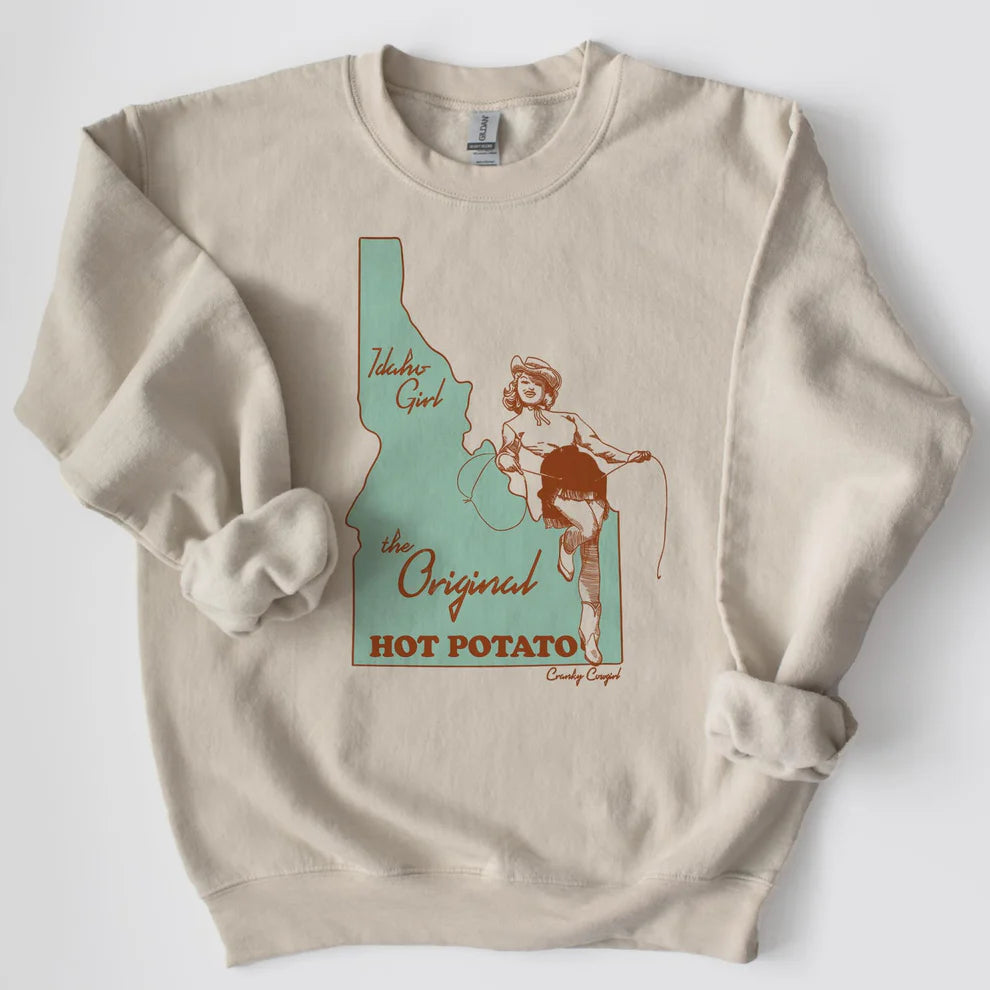 Introducing the perfect addition to any wardrobe: The original hot potato crew neck. Stand out with this sassy cranky cowgirl tee, featuring an Idaho girl design. Stay cool with this quirky and playful shirt, perfect for any country-loving fashionista!