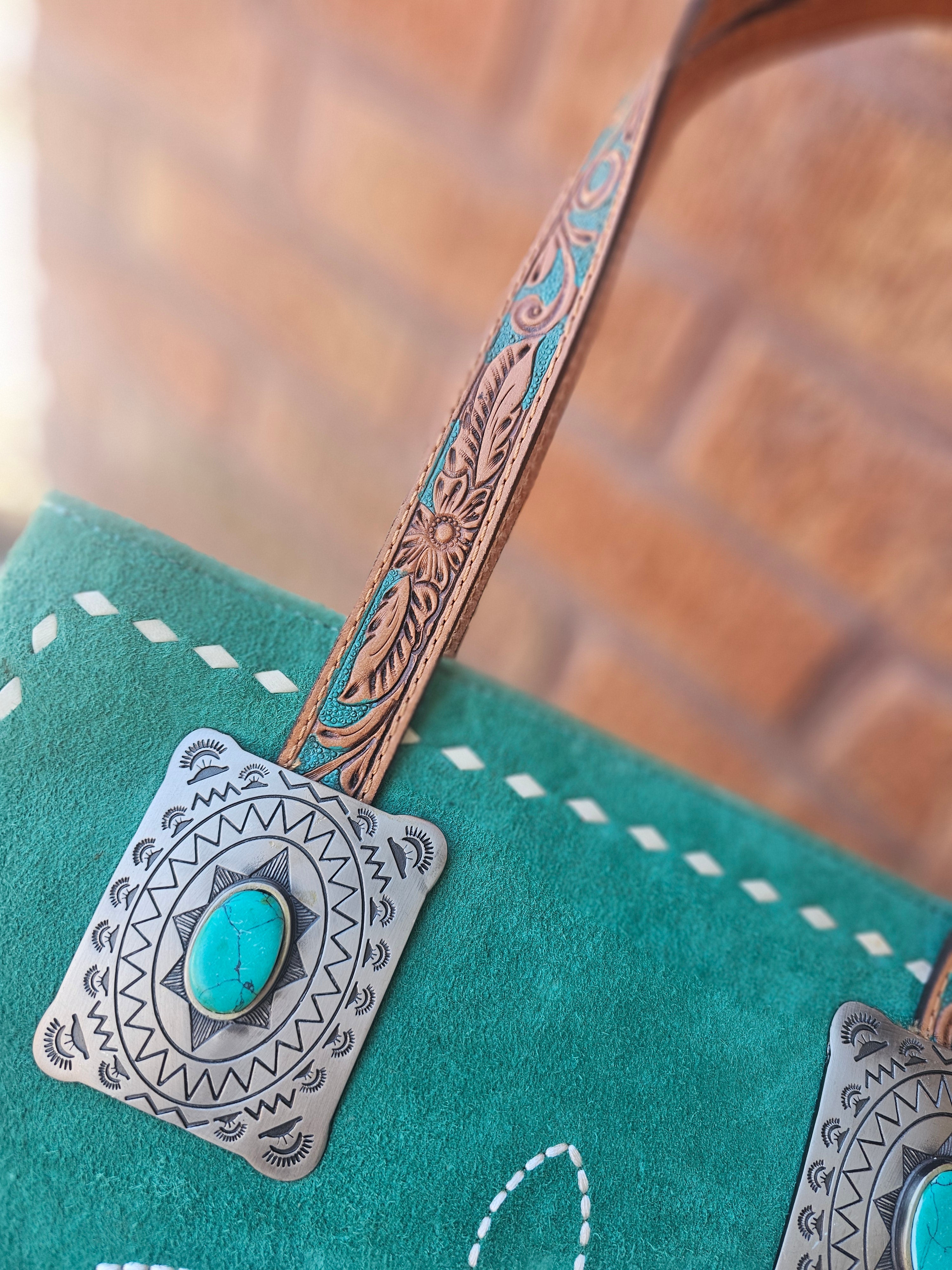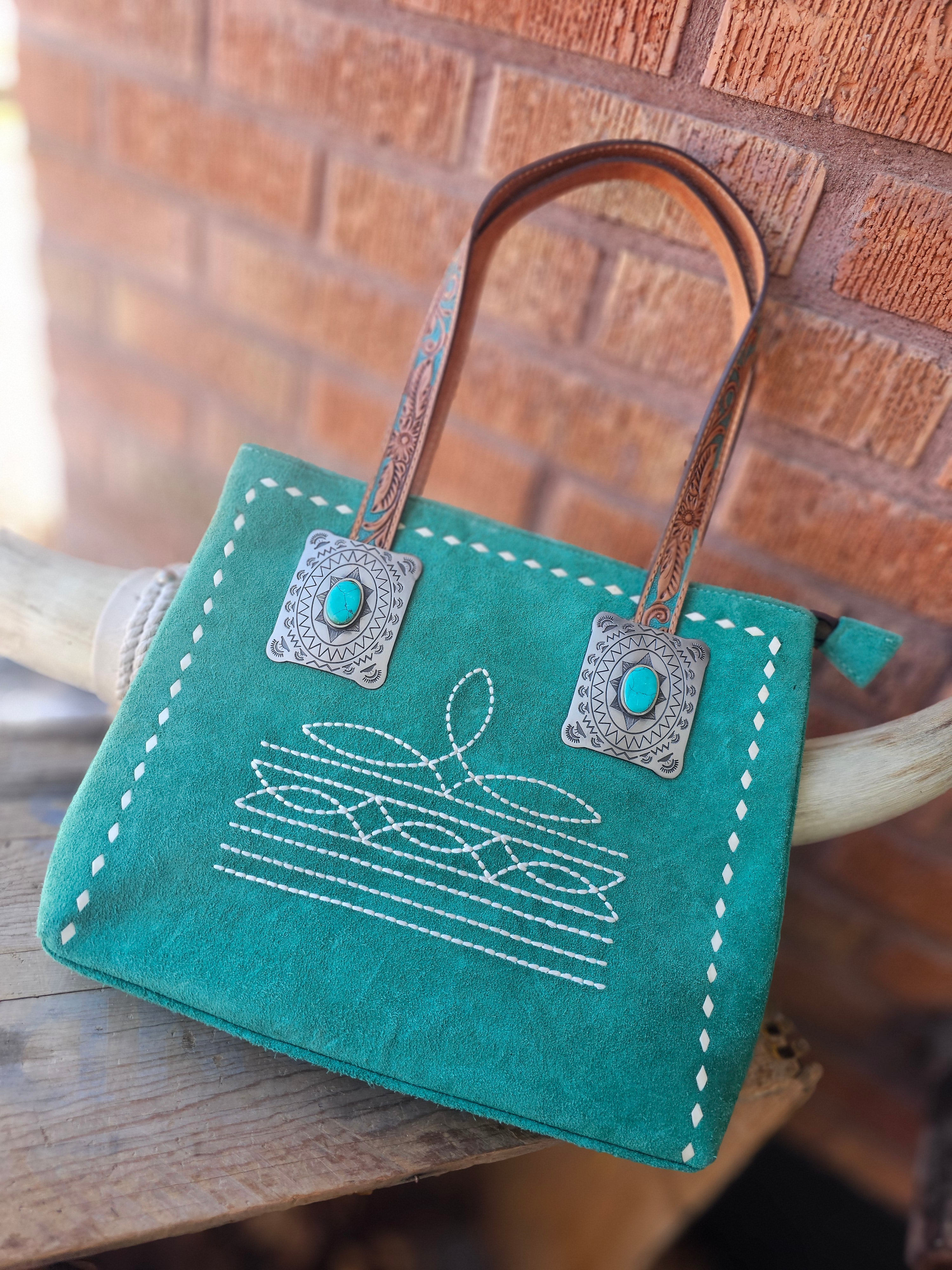 Saddle up with this eye-catching teal shoulder bag, where Western flair meets everyday function. Featuring authentic boot stitch detailing and a striking concho accent, this bag brings that cowgirl spirit wherever you roam. Perfect for toting essentials around town or on the trail, it's got the style to turn heads and the durability to keep up with your adventures. Sling it over your shoulder and let your personality shine through.