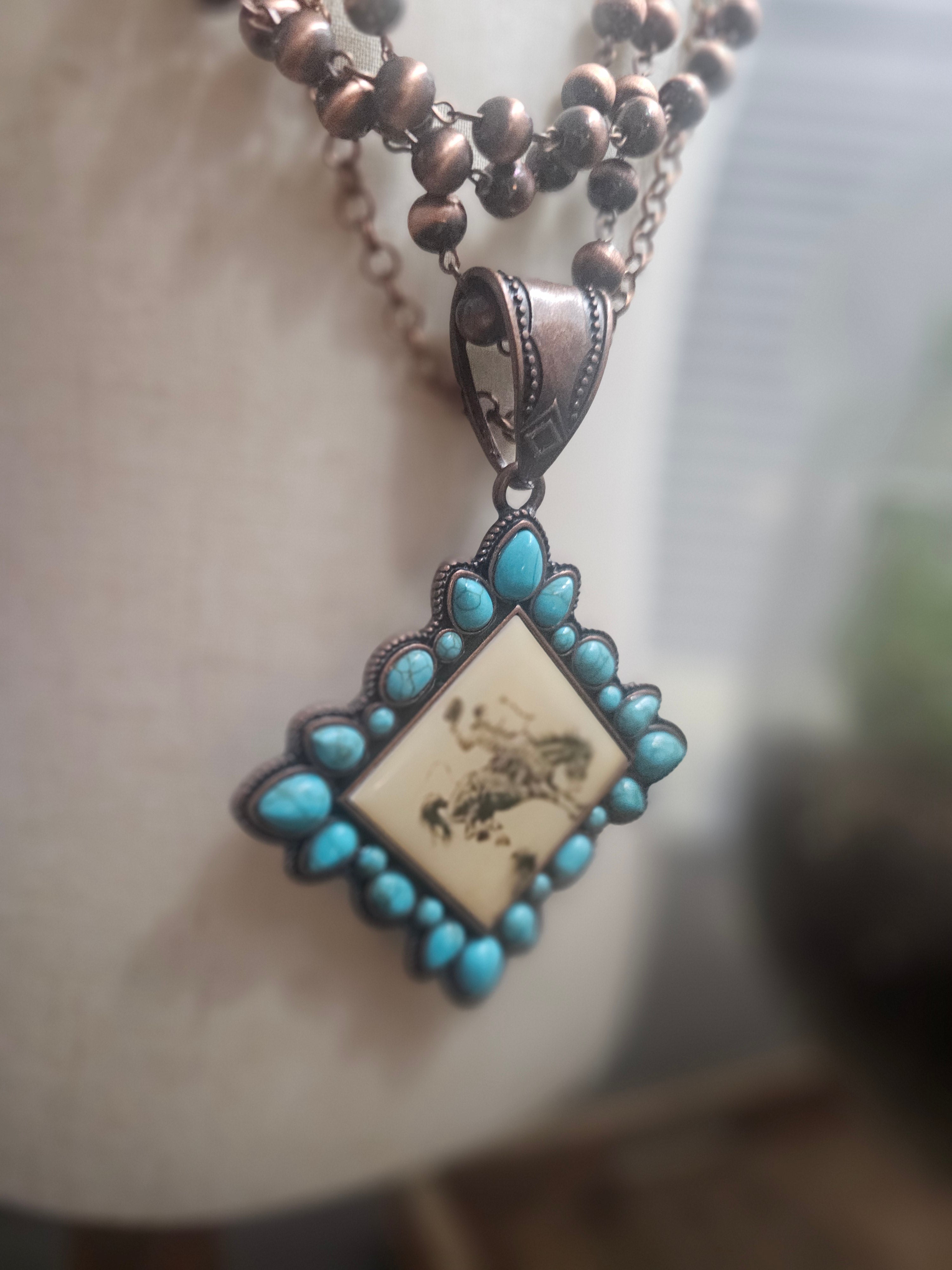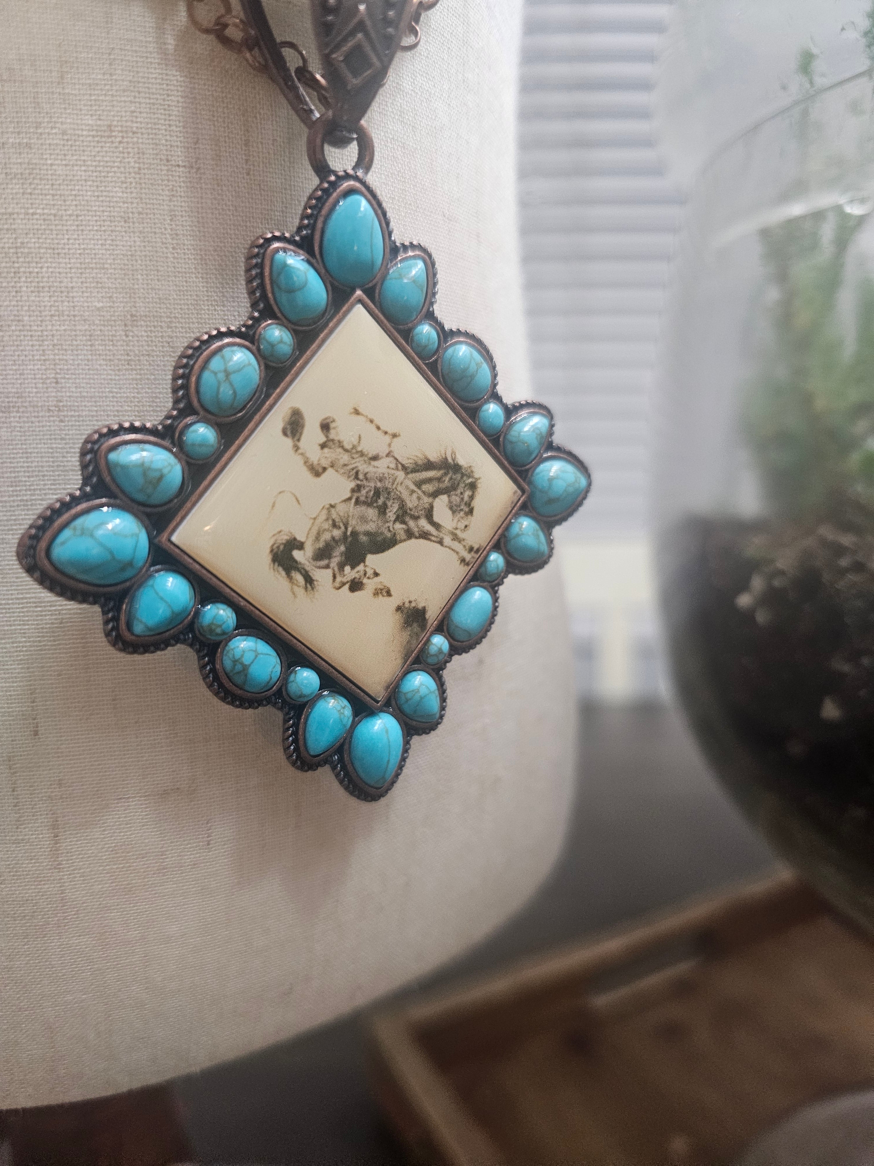 Buck.in Bronze pendant necklace is bold statement piece that captures the spirit of the rodeo. Crafted in warm bronze, this pendant celebrates the thrill and grit of the arena with authentic Western flair. Perfect for rodeo enthusiasts, ranch lovers, or anyone who wants to wear their cowgirl attitude close to their heart. Layer it, rock it solo, or let it be your conversation starter at the next bonfire. Yeehaw!