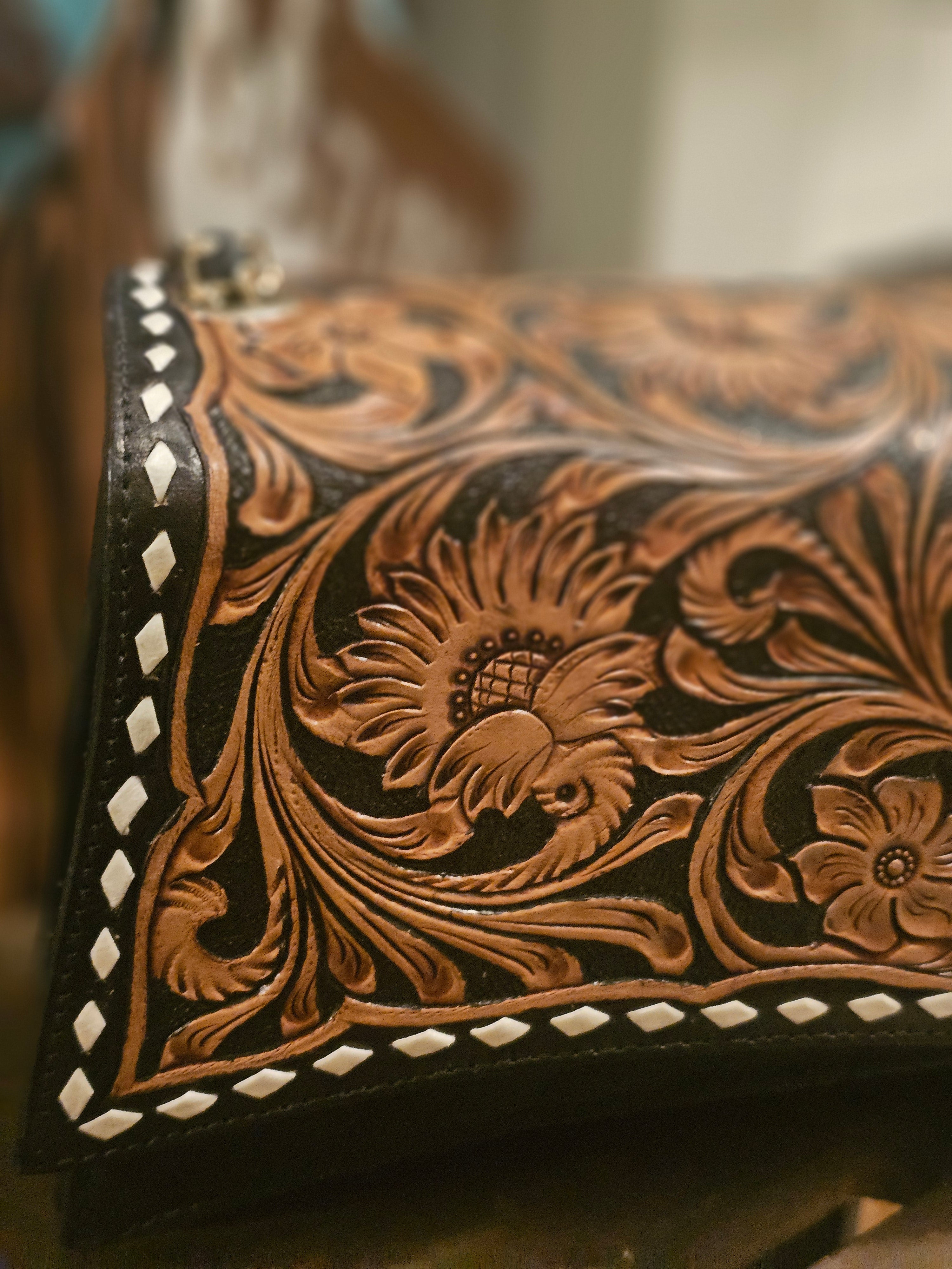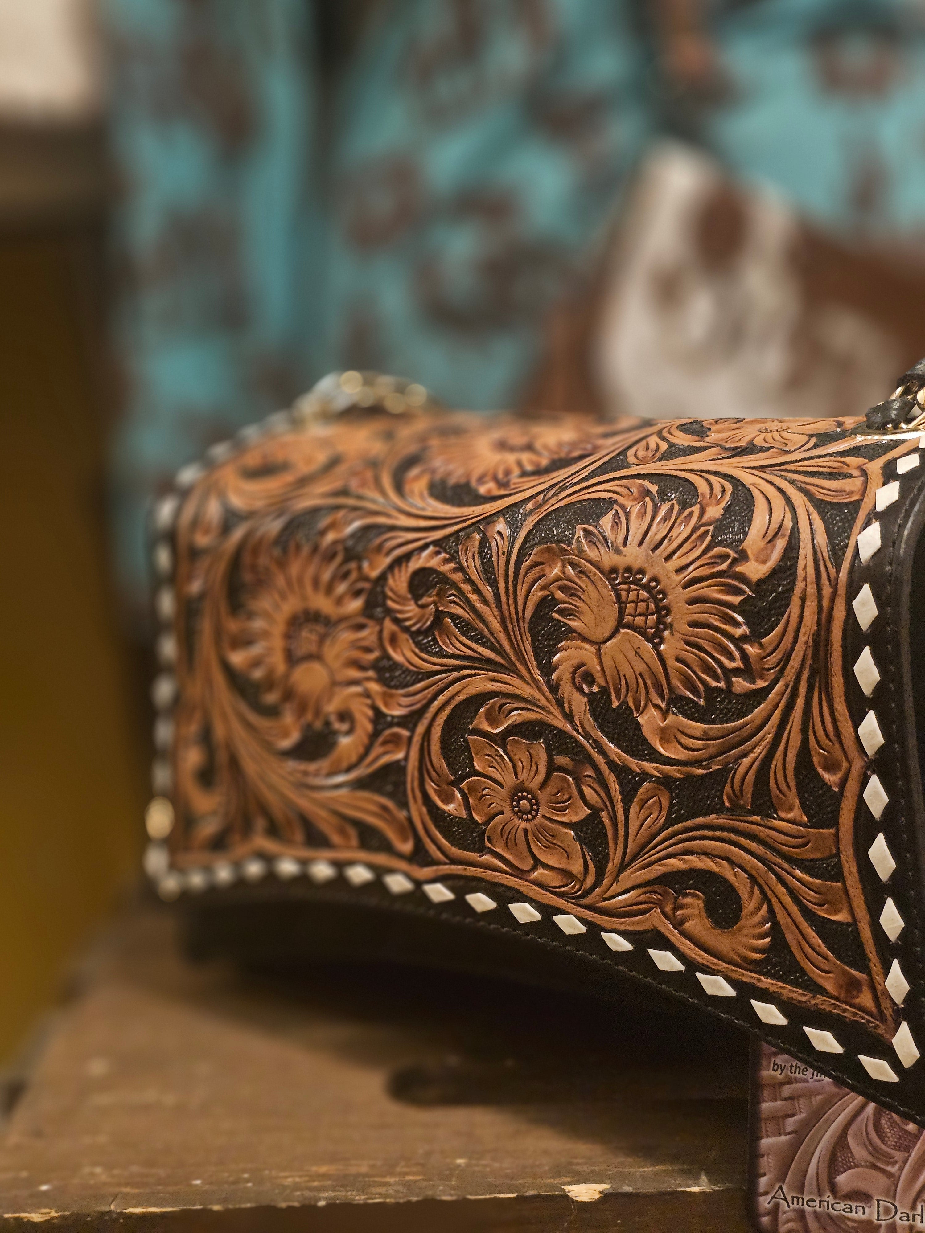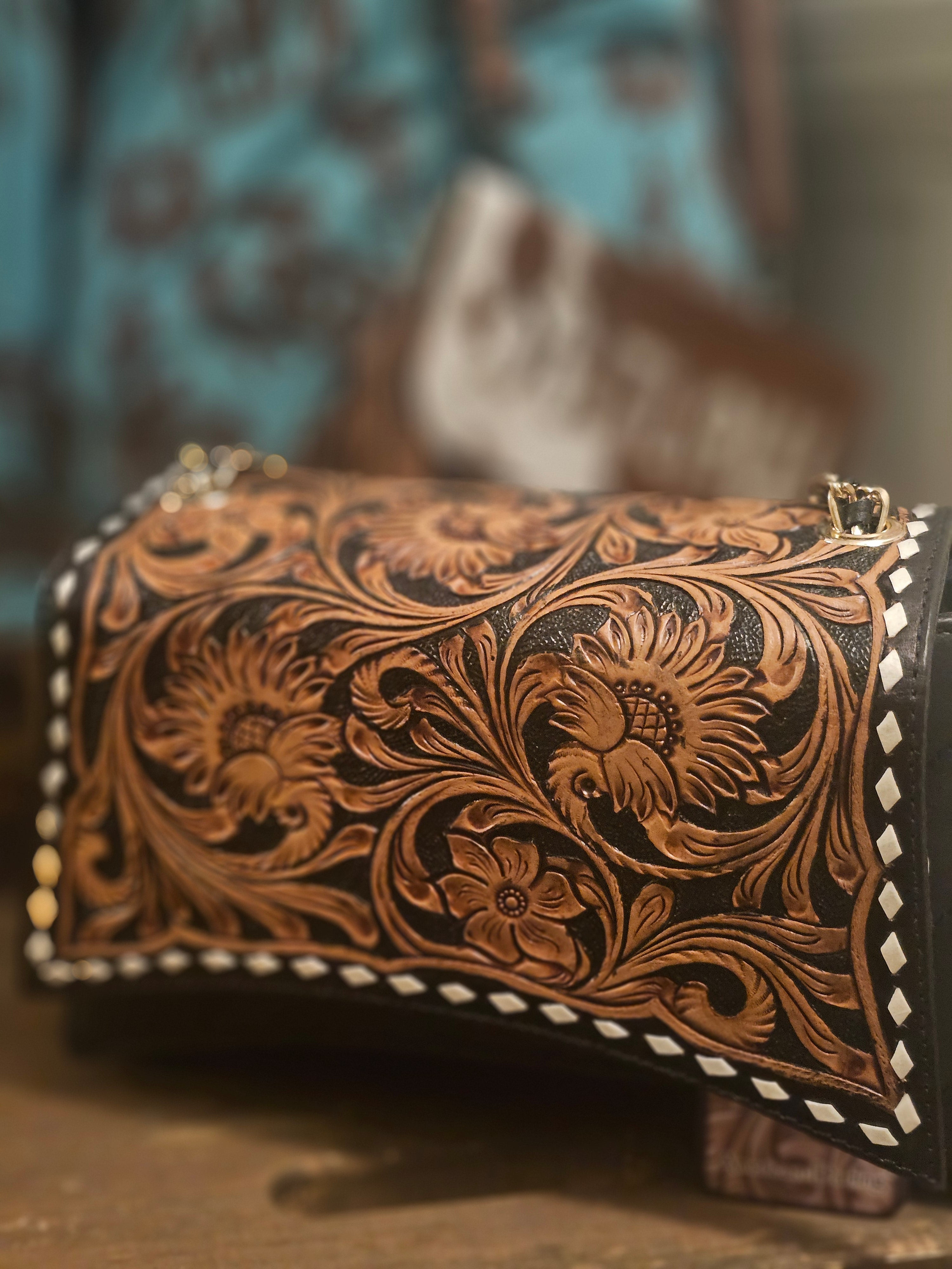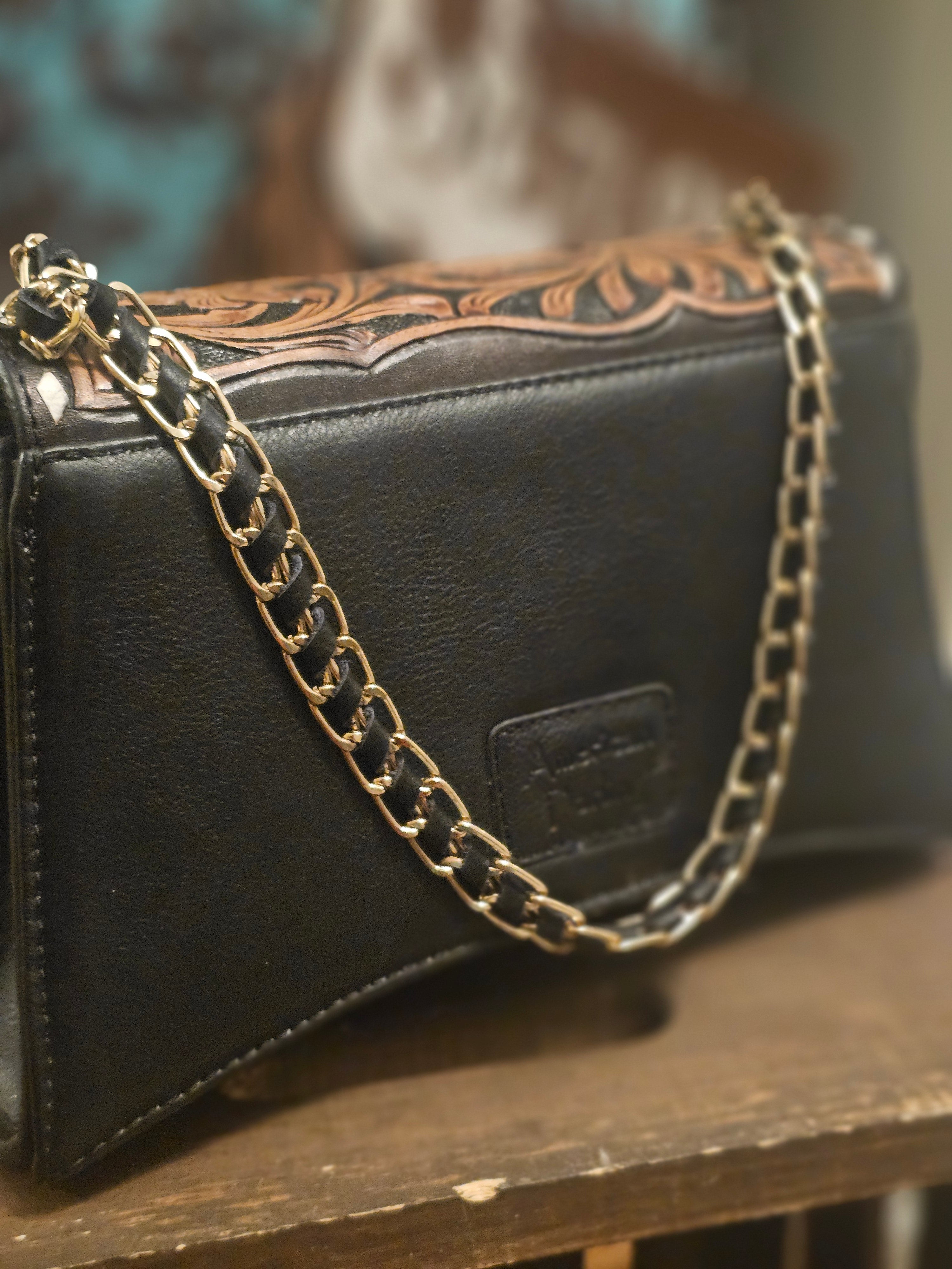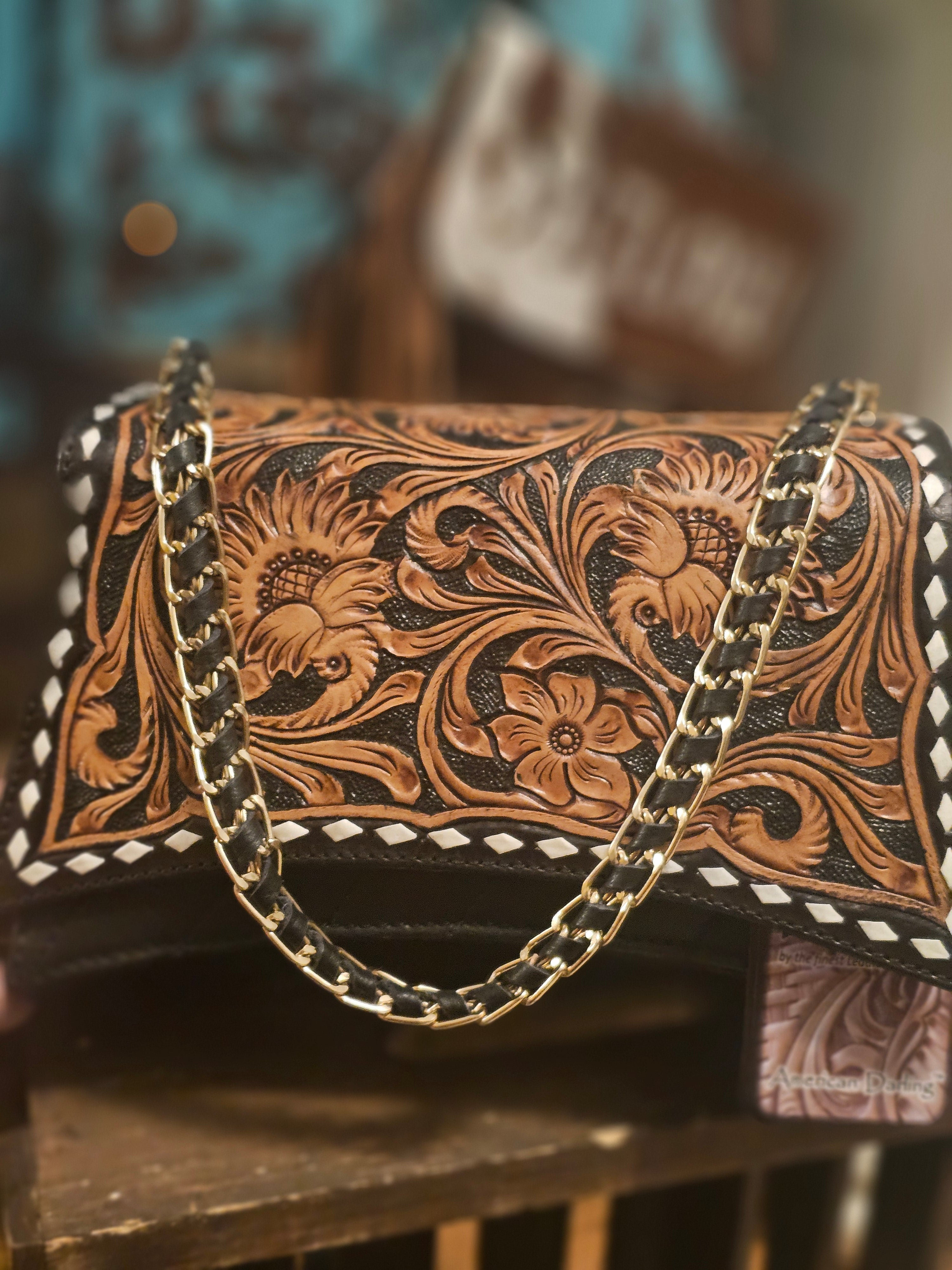 Looking for a cowgirl-inspired purse for the NFR? Look no further than Dazzle me cowgirl! With stunning tooling and a beautiful leather design, this purse is the perfect accessory for any rodeo fan. And don't forget the gold chain strap for a touch of glamour. Saddle up and dazzle 'em, cowgirl!