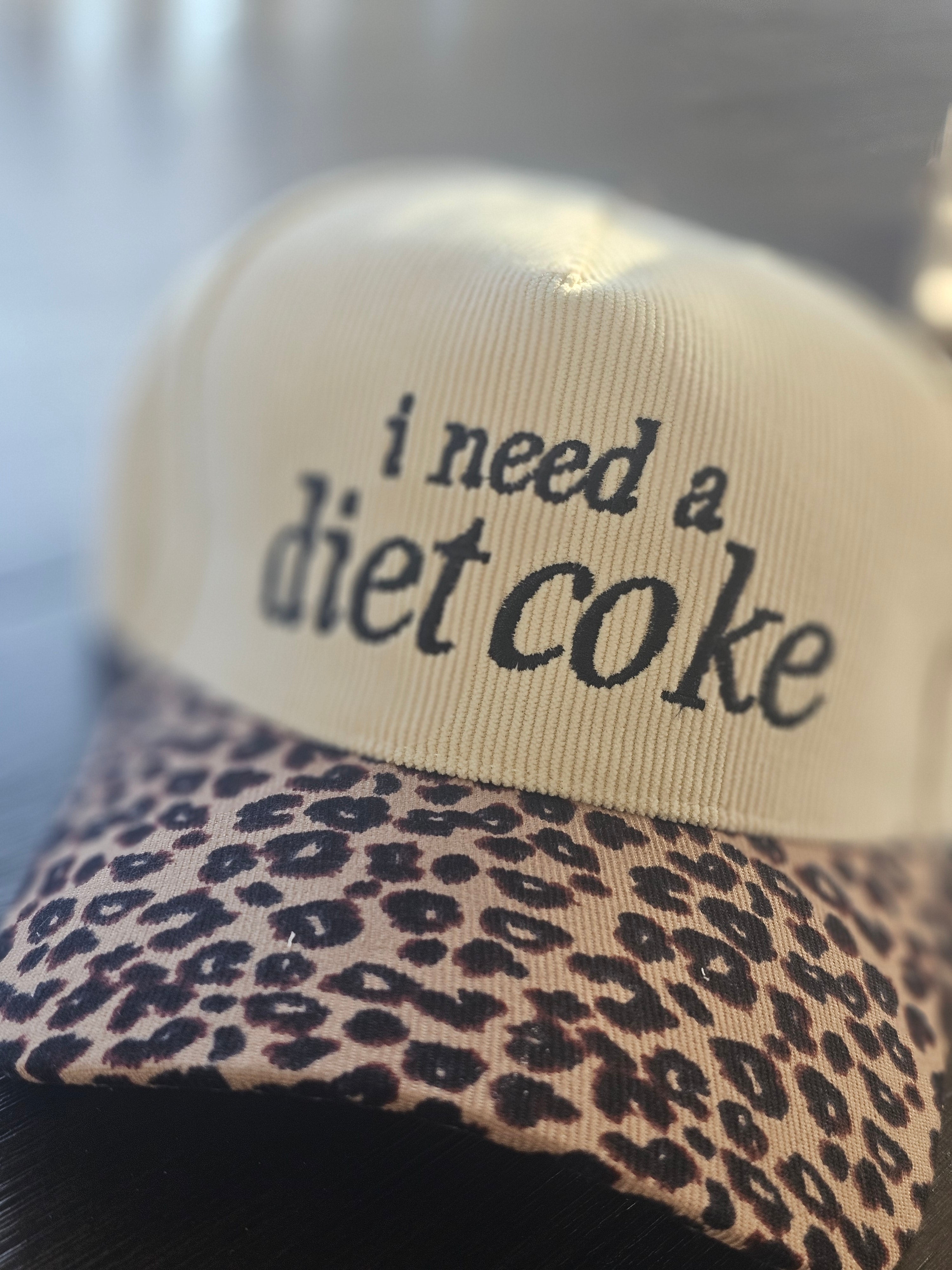 # Diet Coke Leopard Embroidered corduroy Hat Rock that retro vibe with this playful leopard-print hat featuring a Diet Coke embroidered design. Perfect for anyone who loves bold fashion statements and iconic branding, this cap combines vintage-inspired style with a fun twist. The embroidered detail adds dimension and personality, while the structured fit keeps you looking sharp whether you're out on the town or keeping it casual. A must-have for collectors, soda enthusiasts, and anyone who appreciates quirky, conversation-starting accessories.