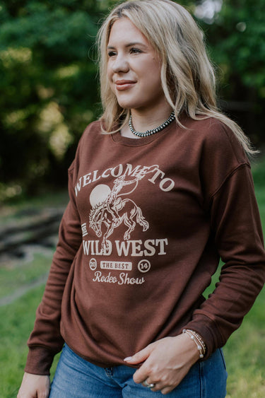 Bring rodeo vibes to your lineup with this bold graphic sweatshirt. The rich brown base sets the stage for a striking bronc rider and vintage rodeo poster-style lettering. Cozy and soft with a relaxed fit, it's an easy go-to that delivers personality and comfort in one.