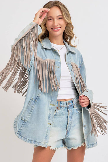 Embrace playful western charm with this vintage-inspired denim jacket. Its oversized, slouchy fit offers comfort while the exaggerated long fringe adds lively movement and bold style. Featuring a classic collar, button-front closure, side pockets, and a rounded hem with side slits, it effortlessly blends timeless denim with a fun cowboy twist. Perfect for adding a chic western edge to any outfit.